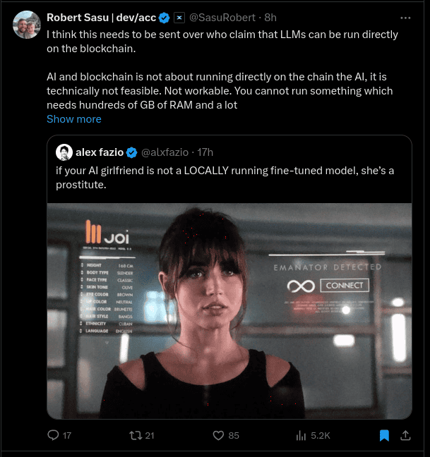 This core developer of MultiversX says that AI and blockchain is not about running AI directly on the blockchain because it’s technically not feasible.